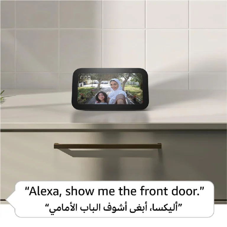 - Meet Alexa – Voice-controlled 5″ smart display with speaker and alarm clock that uses the Alexa Smart Assistant so you can see news and weather at a glance, play music, recite the Holy Quran, set timers and alarms, make your home smarter with compatible devices, and more.